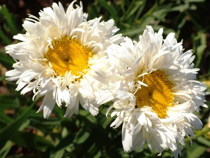 Нивяник Crazy Daisy - многолетнее растение, относящееся к семейству астровых. Цветы диаметром до 8 см, белые с желтым центром, как у типичной ромашки, только вот лепестки совсем необычные сильнорассеченные. На одном кусте встречаются махровые и полумахровые ромашки. Цветение начинается в июне и продолжается до конца августа. Куст высотой до 70 см, образует пышную розетку листьев. Листья темно-зеленые, длинные и узкие, перистые, покрыты короткими волосками.