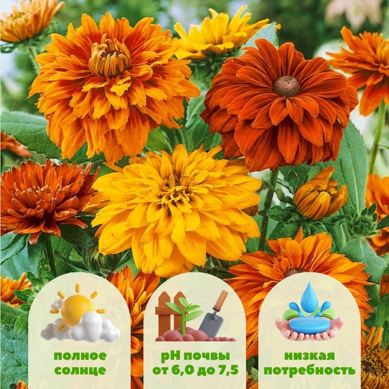 Rudbeckia hirta Cherokee Sunset — создаёт эффект «тёплого сада» и идеально подходит тем, кто любит естественные, живописные композиции. Её можно использовать в солнечных миксбордерах, деревенских цветниках, природных композициях, на заднем или среднем плане клумбы. В одиночных посадках она привлекает внимание яркостью, а в групповых создаёт ощущение пышного, богатого цветом ковра. Особенно эффектна в сочетании с синими и фиолетовыми растениями: шалфеем, вероникой, лавандой. Цветки отлично стоят в срезке и прекрасно дополняют букеты, придавая им ощущение солнечного света даже в пасмурный день.Рекомендации по посадке и уходу