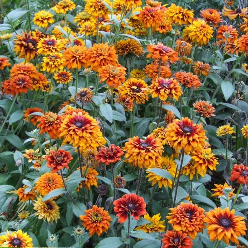 Это один из самых эффектных сортов рудбекии волосистой, отличающийся махровыми и полумахровыми цветками диаметром до 7–10 см. Лепестки узкие удлиненные с легкими зубцами на кончике. Цветки ценятся за богатую палитру и неповторимость каждого экземпляра: на одном растении могут появляться бутоны разных оттенков — от золотистого до бордового. Куст прямостоячий, высотой до 75 см, с прочными цветоносами и густой опушённой листвой. Цветение продолжительное с июля и до первых заморозков, благодаря чему рудбекия Чероки Сансет остаётся декоративной почти всё лето и осень. Зимостойкость высокая до -29°C.Универсальность использования в саду