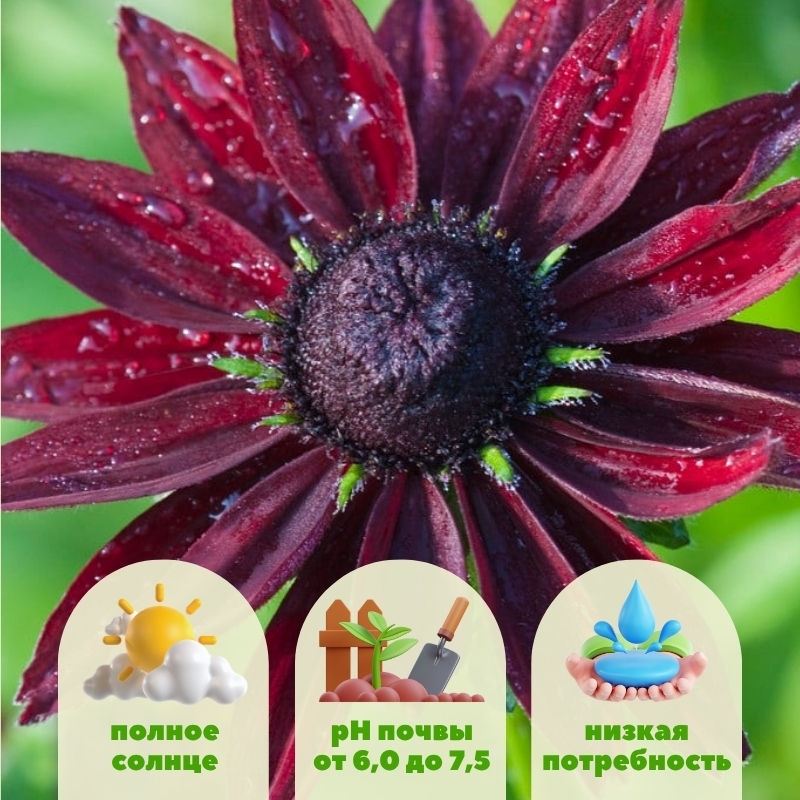 Выбирайте участок с полным солнцем или минимум 6-8 часами прямого света, тогда рудбекия максимально раскроет цвет. Почва рыхлая, хорошо дренированная, умеренно плодородная, предпочтительно с добавлением органики, без чрезмерного увлажнения и без застоя воды. Полив требуется умеренный, после укоренения растение устойчиво к засухе, но в период цветения желательно обеспечить равномерное увлажнение. Удаляйте увядшие цветы, чтобы стимулировать их повторное появление. Весной можно внести лёгкое удобрение для старта. Также важно оставить между растениями расстояние около 30–40 см, чтобы куст правильно развивался и цветение было обильным. При посадке в контейнере — обязательно обеспечить хороший дренаж и не допускать длительного переувлажнения.Рудбекия частично многолетнее растение и может пережить несколько сезонов. Но это не значит, что вы потеряете куст через несколько лет. Она отлично размножается самосевом, поэтому сама себя возобновляет.