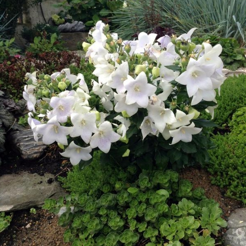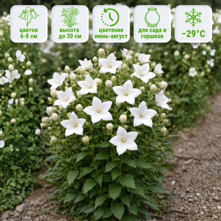 Platycodon White идеально подходит для цветников, миксбордеров, рокариев и контейнерного выращивания. Белый оттенок гармонично смотрится как в одиночных посадках, так и в композициях с лавандой, шалфеем и другими многолетниками. Это растение добавит свежести и лёгкости в любой уголок сада, подчёркивая его изящество.Посадка и уход за платикодоном