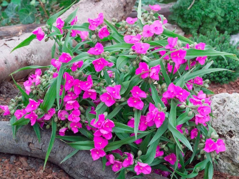 Tradescantia andersoniana Karminglut универсальна в садовом дизайне. Она превосходно смотрится как в бордюрах, так и в миксбордерах, где её яркие цветы создают интересные акценты. Её можно использовать для смягчения строгих линий клумб или как часть живописных цветочных групп. Традесканция великолепно гармонирует с другими многолетниками, особенно с синими и белыми растениями, добавляя им контраст и глубину. Её компактный размер делает её подходящей для контейнеров, добавляя цветущие пятна на террасах или балконах.Посадка и уход за традесканцией: