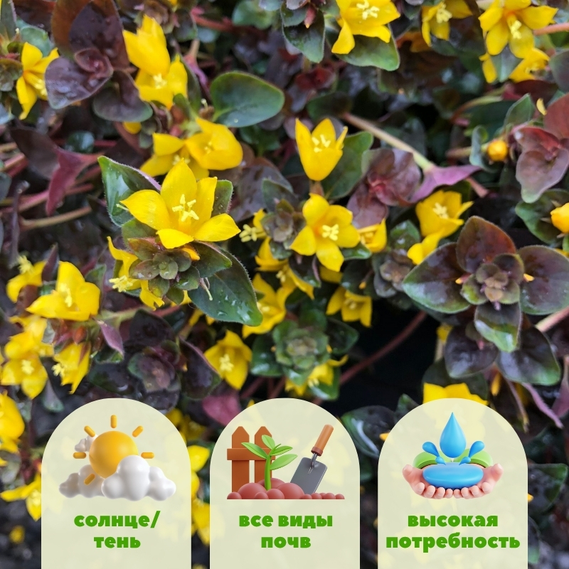 Лизимахия Персидский Шоколад — низкорослый многолетник, формирующий плотный, стелющийся ковёр высотой около 10–15 см и шириной до 40–50 см. Листья округлые, глянцевые, меняют окрас от весеннего пурпурно-зеленого и летнего шоколадно-пурпурного, до осеннего - красного. Цветки ярко-жёлтые, звёздчатые, диаметром около 1,5–2 см, распускаются в мае–сентябре в небольших соцветиях. Цветение обильное и продолжительное. Вербейник Персиан Шоколад в мягком климате сохраняет листву круглый год, но у нас он не способен зимовать в открытом грунте. Его зимостойкость около -7°C, потому чаще всего выращивается как почвопокровник в контейнерах, подвесных кашпо или как однолетник.Универсальность и применение в саду