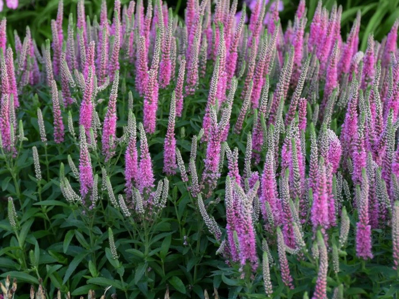 Когда зажгутся розовые свечи? В период с июля по август. Цветки собраны в плотные соцветия-колоски пастельно-розового оттенка, которые взмывают вверх из плотной розетки листьев. Листья узкие, насыщенного зелёного цвета, создают приятный контраст цветам. Сорт формирует аккуратные кустики высотой 25–30 см, что делает её подходящей для переднего плана цветников. Вероника хорошо переносит морозы до -28°C и не требует постоянного ухода, кроме полива. Во время цветения привлекает бабочек и пчёл, добавляя жизни саду. Может использоваться для срезки.Универсальность в саду: