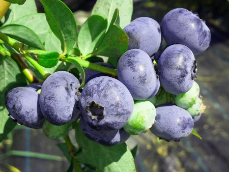 Голубика Earliblue формирует ягоды среднего размера, в диаметре до 15 мм, весом около 2 г. Плоды светло-голубого цвета имеют сферическую форму, слегка приплюснуты, выровнены. Они сгруппированы в плотные, густые, многоплодные кисти, которые долго не осыпаются после созревания.