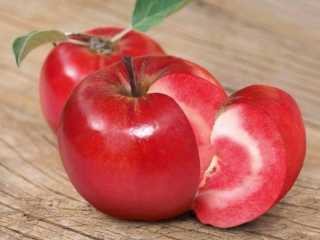 Яблоня Ред Кэтти не так давно появилась в российских садах, но уже вызвала фурор среди обывателей. Манящий рубиновый окрас яблок просочился глубоко вовнутрь яблока, сделав его мякоть красного цвета. В разрезе виден небольшой кремовый глазок. Сладко-кислый плод придется по нраву всем членам семьи. Крупные округло-приплюснутые яблоки в небольших светлых веснушках. Плоды массой 150 гр созревают в конце сентября - сорт относится к ранне-поздним. После съёма становятся ещё вкуснее и аромат становится ярче. Для садоводов сорт просто находка, любители консервации могут изготовить не мало блюд из него, а любители свежих плодов смогут наслаждаться ими вплоть до января. Лежкость доходит до 3-3,5 месяцев.