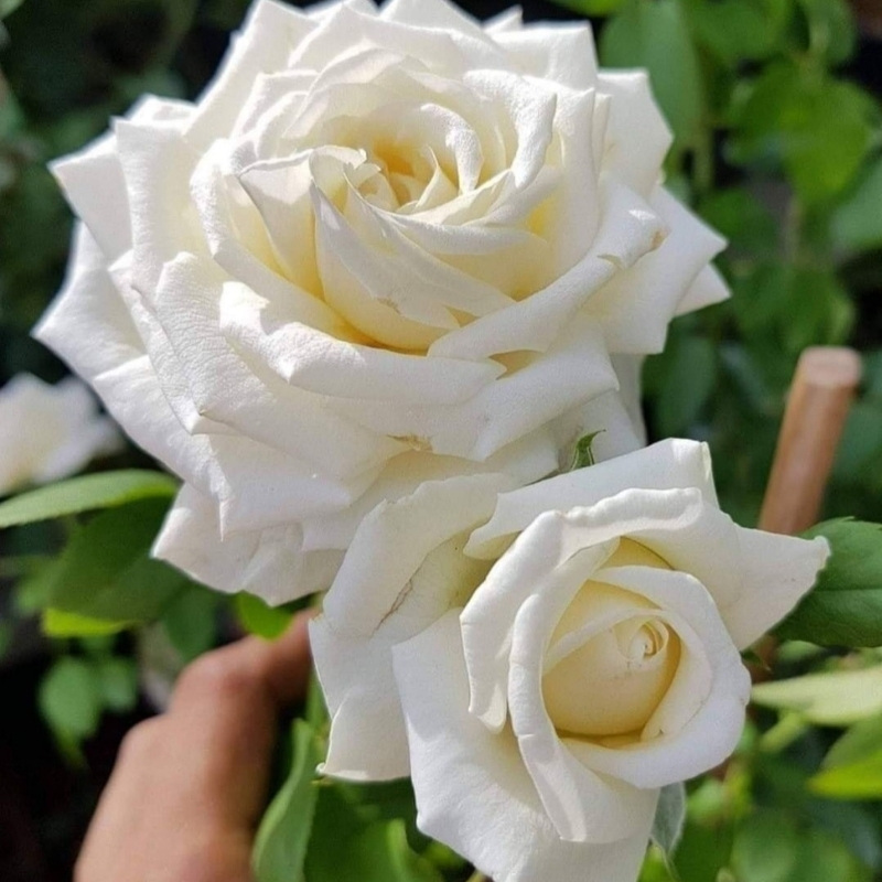 Что же это за аромат? Свежесть мяты и лимонный запах вербены с травянистыми нотками. Её крупные, до 12–14 см, пышные бутоны формируют роскошные розетки, чашевидной формы при раскрытии и переходящей к классическому квартетному строению с чуть загнутыми лепестками, создавая ощущение утончённой элегантности и чистой красоты. Цветки составляют до 90–100 лепестков, что делает её одной из наиболее густомахровых современных чайно-гибридных роз. Цвет белый с кремовым основанием, иногда в нём рассматриваются прохладные голубоватые оттенки. Куст прямостоячий, высотой 80–90 см и шириной 50–70 см, листь темно-зелёные, кожистые, полуматовые. Цветение повторное и обильное с июня до заморозков с устойчивостью к мучнистой росе, чёрной пятнистости и ржавчине. Зимостойкость до -23°C.Универсальность использования в саду: