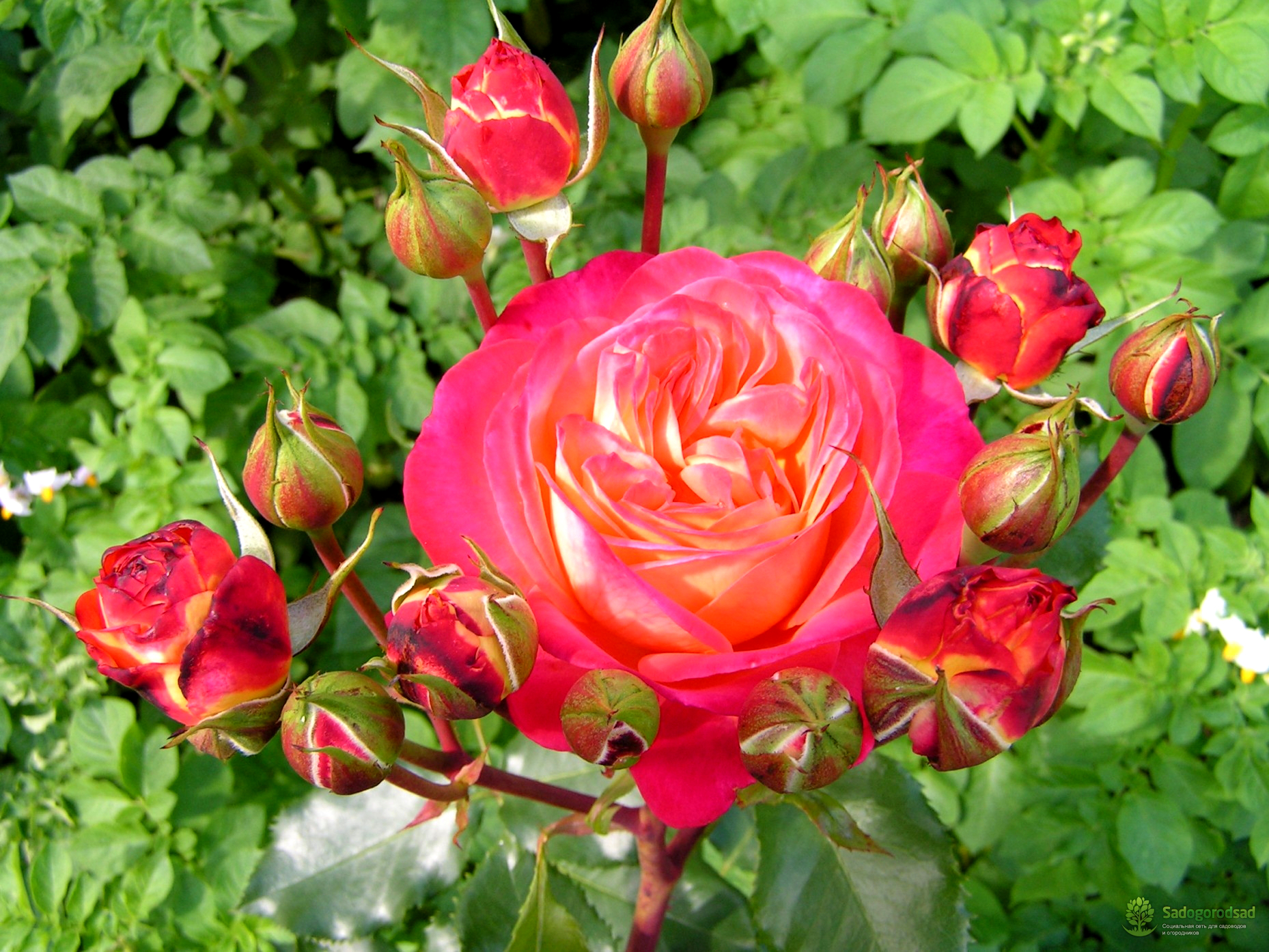 Как игриво смотрятся бутоны розы Мидсаммер на кусте, богатые переливы, аппетитные оттенки, клубнично-банановый коктейль - так можно описать расцветку. Желтые у основания и коралловые по краям лепестки плотно держат красивой формы бутон. Второе богатство розы, помимо цвета, в её соцветиях по 5- 10 шт, один срезанный стебель сравним с букетом. Цветок среднего размера 6-8 см в диаметре имеет густой, средней интенсивности аромат. Бутоны долго держатся, слегка подтемняя красный тон со временем до малинового.