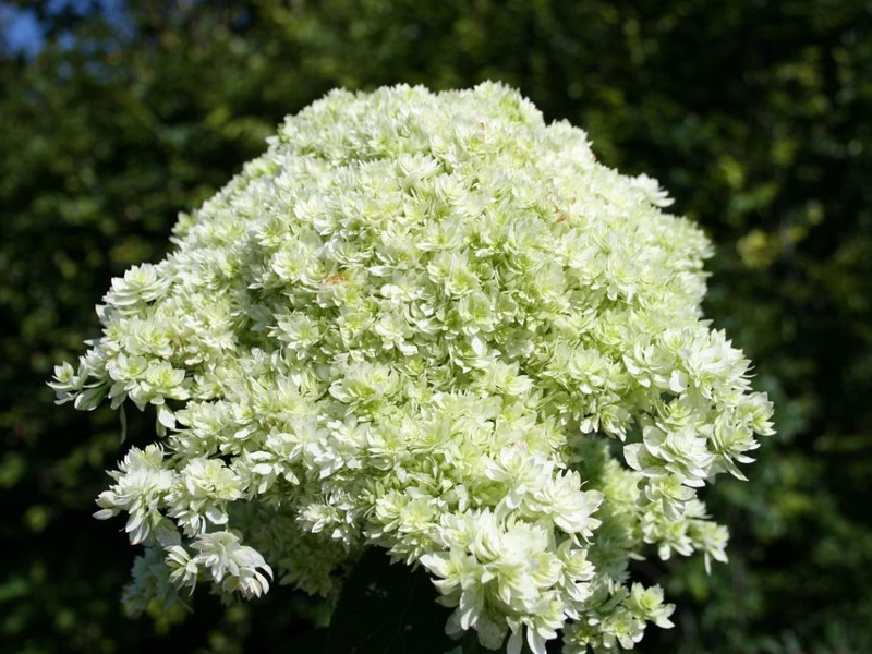 Почему древовидная гортензия Hayes Starburst так хороша? Всё дело в цветках - они махровые. Даже миниатюрный одного цветка размером в 2 см радует пышностью. Звёздчатые цветочки собраны в одно зонтиковидное соцветие, оно не однообразно и имеет форму и полусферы, и купола, и пирамиды, что совсем не портит вид растения, а, наоборот, делает его уникальным. Цветы по краям распускаются раньше, чем те, что в центре. Потому на кусте присутствует бело-зелёная гамма. Зеленый цвет сходит к середине цветения, которое начинается в конце июня и завершается с приходом заморозков. Такие соцветия смотрятся весьма броско ещё и потому, что размер их около 25 см в диаметре.