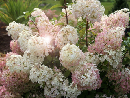 Довольно часто мы слышим про цветочный белый куст, что он похож на облако. Так вот, всё о чем ранее говорили, просто меркнет, когда Вы встречаетесь с цветущей гортензией Бобо. Этот цветок влюбляет с первого взгляда. По настоящему пышное, обильное, объемное, взрывное цветение, которое не оставляет равнодушным зрителей. Белые цветы с нежным желтым оттенком появляются уже во второй половине июня, цветение настолько длительное, что плавно перетекает с лета на осень. К сентябрю цветки румянятся и приобретают красивый розовый оттенок. Соцветия широкопирамидальные, очень крупные, высотой около 15 см. Состоят из мелких цветков простой формы. Такой цветочный шар медленно нарастает, прибавляя в росте всего 10 см за сезон. Но самое интересное, что данная гортензия карликовая.