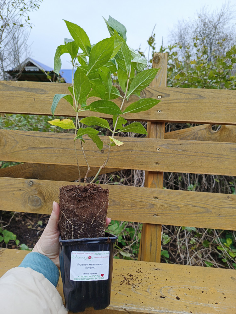 Корневая система саженцев гортензии Бонфайр представлена в каталоге в контейнерах.