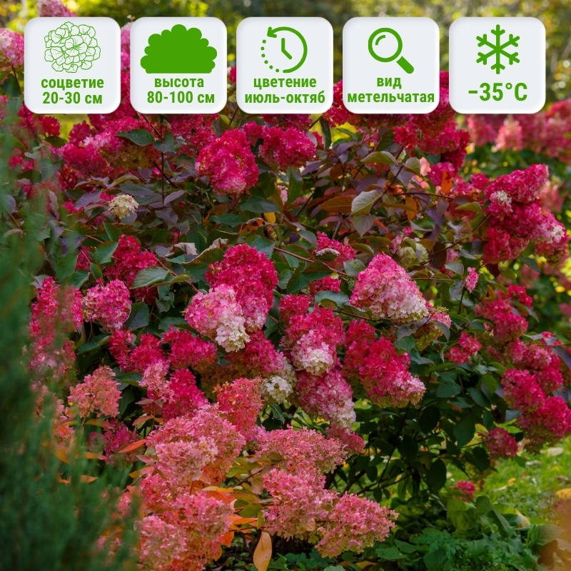 Зрелый куст вырастает примерно до 1 м в высоту и около 0,8 м в ширину, сохраняет аккуратную вертикальную форму. Побеги коричневые, крепкие. Листья тёмно-зелёные, средней величины, слегка шершавые на ощупь. Соцветия плотные, конические, длиной 20–30 см. Цветение начинается в июле и продолжается до октября: от кремово-белого старта до ярких красно-малиновых тонов к финалу сезона. Под тяжестью пышных соцветий ветви иногда грациозно поникают. Зимостойкость: сорт отличается высокой выносливостью и переносит морозы до −35 °C, что делает его доступным для выращивания в большинстве регионов РоссииУниверсальность использования в саду