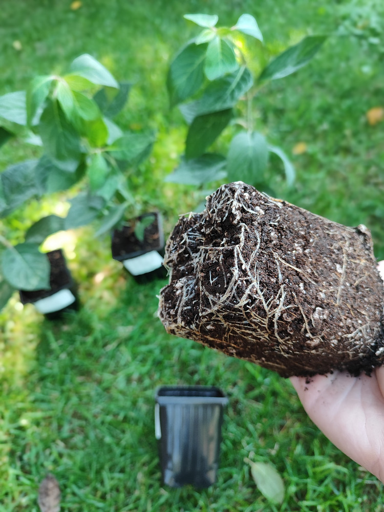 Корневая система саженцев гортензии метельчатой Полистар представлена в каталоге в контейнерах.