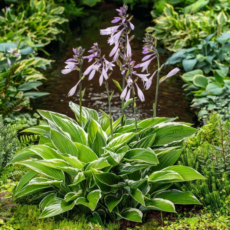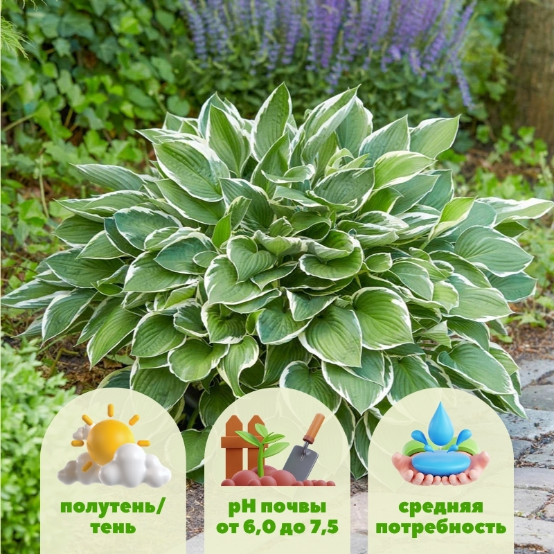 Многолетник формирует плотный дугообразный куст высотой примерно 55 см и шириной до 100–125 см. Листья сердцевидные тёмно-зелёные с тонкой чёткой белой каймой. Длина листа примерно 15 см. Цветки воронковидные или колокольчатые, бледно-лавандовые, появляются с конца июля до августа на цветоносах высотой около 70 см. Зимостойкость до -35°C, хорошо растет в полутени, требует защиты от холодных сухих ветров.Универсальность использования в саду
