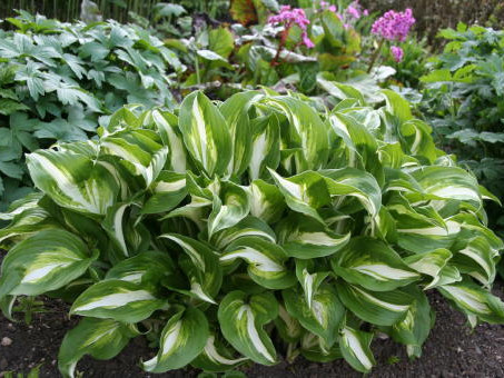 Хоста Undulata (Волнистая) оригинальное небольшое растение с темно-зеленой окантовкой кремово-белых листьев. Этот невысокий, до 40 см в высоту фонтан пестрой листвы создаст яркое пятно в тенистом углу вашего сада. К середине июля красивые пестрые кусты этого растения выбрасывают стрелку-цветонос с лилиецветного типа цветами светлого лавандового оттенка.