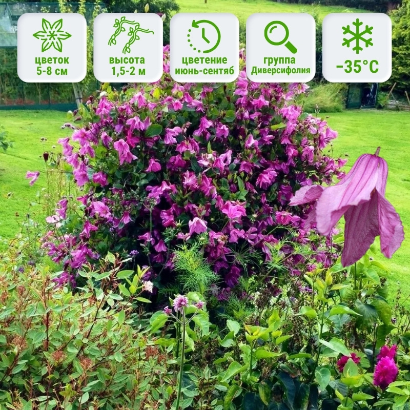 У радости много лиц, имён и форм. Одна из них клематис Alionushka (Аленушка). Рассмотрим сорт поподробнее.