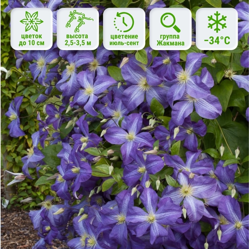 Сорт образует мощные лианы длиной 2,5–3,5 м, которые легко обвивают опоры и быстро формируют зелёные стены. Цветки средне-крупные до 10 см в диаметре, простые, состоят из 4-5 шт лепестков сине-голубого цвета с контрастными белыми лучами, исходящими из центра бутона. Пучок нитей желто-кремового ненавязчивого цвета. Цветение продолжается с июля по сентябрь на побегах текущего года. Сорт отличается неприхотливостью, устойчивостью к болезням и высокой зимостойкостью (до −34°C). Относится к 3-й группе обрезки. Группа Жакмана.Универсальность использования в саду