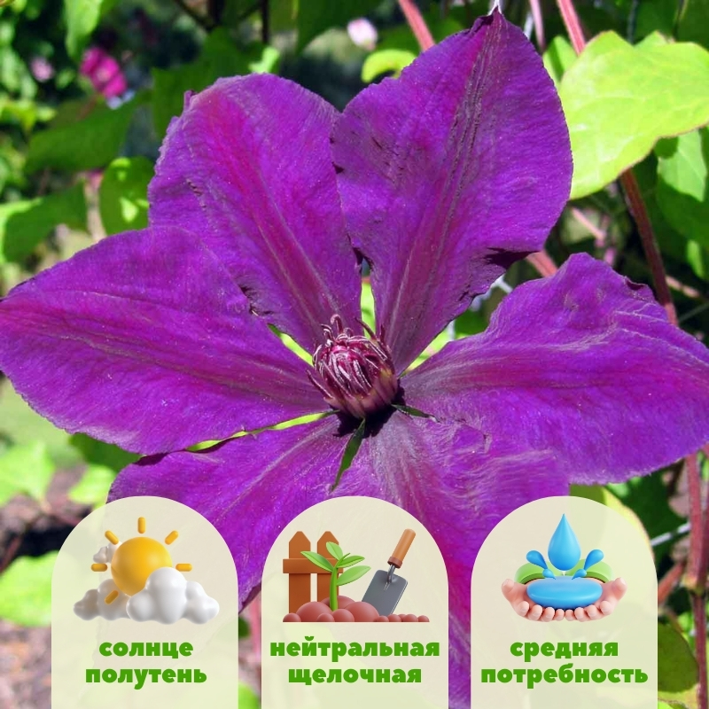 Clematis Gipsy Queen идеально подходит для вертикального озеленения и потому роскошно смотрится на арках, беседках, перголах и высоких шпалерах. Его тёмно-фиолетовые тона создают выразительный контраст с розами розовых и абрикосовых оттенков, декоративными кустарниками и хвойными растениями. Этот сорт одинаково хорош в качестве солитера и в многослойных композициях, где он добавляет саду глубину, массивный цветочный декор и возможность скрывать недостатки участка.Рекомендации по уходу за клематисом Джипси Квин и его посадке: