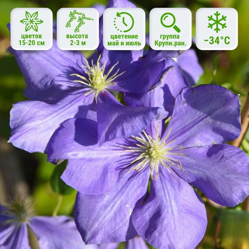 Этот сорт относится к группе ранних крупноцветковых. Цветки большие до 15–20 см в диаметре, раскрываются с конца мая на прошлогодних побегах, а затем во второй половине лета и осенью — на молодых. Цвет красивый, варьируется от освещения, преобладают лилово-голубые краски, немного фиолетовых мазков у центра кремово-зеленых тычинок. Куст достигает высоты 2–3 м, отличается умеренным ростом и аккуратным видом. Листва тёмно-зелёная, создающая выразительный фон для ярких соцветий. Если лето в вашем регионе очень жаркое, то выбирайте место посадки с легкой тенью в обеденные часы, поскольку на ярком солнце цветки начнут белеть. Сорт хорошо зимует, выдерживая морозы до −34°C. Относится ко 2-й группе обрезки.Универсальность использования в саду