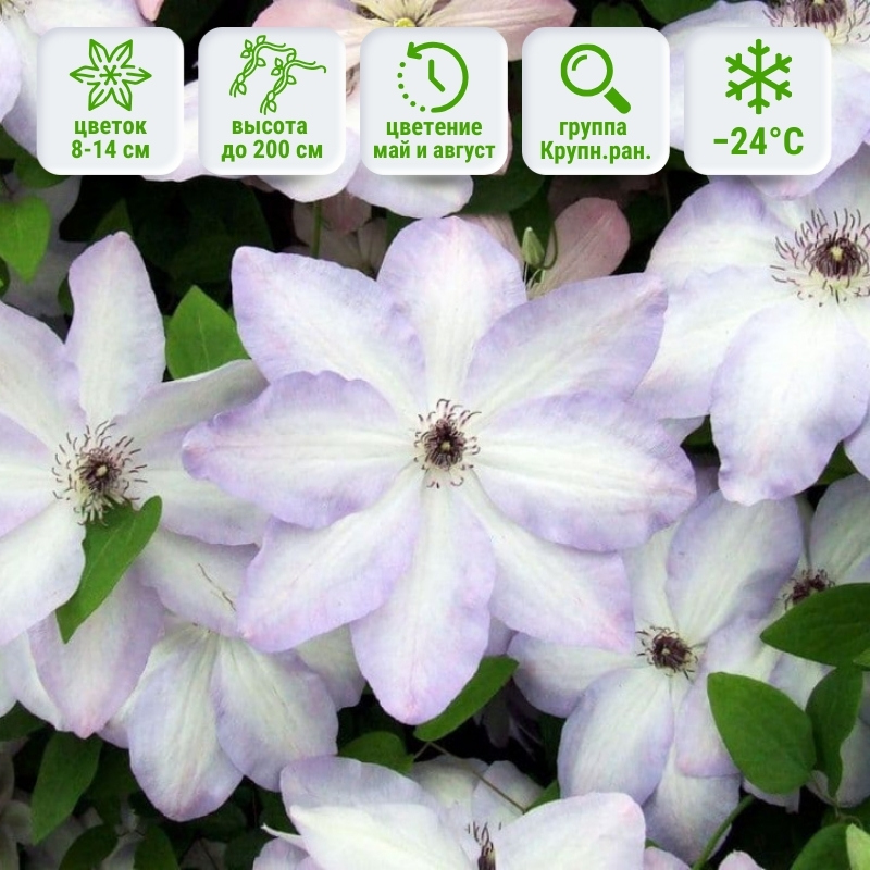 Только нежность, свежесть и морозное дыхание будут исходить от вашего плетистого питомца - клематиса Иван Олссон (Ivan Olsson). Его двуцветные крупные цветки покрывают куст дважды за теплый сезон, возвращая в сад снежные сугробы, не тающие под ярким солнцем.