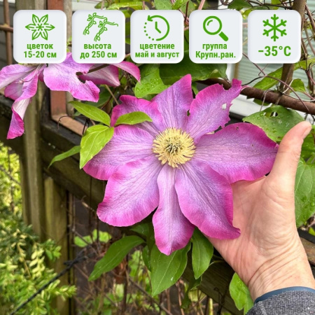 Первый спорный момент этого сорта - а каков всё же его цвет? Одни находят его темно-розовым с лиловой полосой, другие ярко-розовым с бледным центром, третьи величают его красным с бледно-лиловой полосой. И это тот самый наглядный пример того, как разные условия выращивания влияют на растение. Цветок также заметно разнится в разные сроки цветения. Так в мае-июне сорт клематис Какио выдает около 8-ми чашелистиков (реже больше), которые у своего основания слегка перекрываются, а в августе-сентябре цветки менее пышные с меньшим количеством лепестков. Диаметр цветка 15-20 см!Змеящаяся вверх лиана карабкается довольно высоко, взрослое растение может достичь 3 м. При этом клематис Kakio не занимает вширь много пространства, разветвление его слабое и потому он идеально вписывается в узкие пространства. А потому компактность его позволяет выращивать его в больших контейнерах и располагать в любой сложной зоне сада. Зимостойкость до -34℃. Группа обрезки 2.