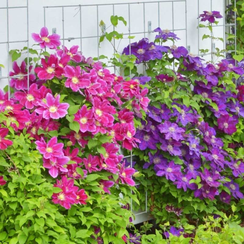 Нельзя забывать, что врагом всех клематисов является ветер, поэтому места надо выбирать мало продуваемые. Нужно обязательно подумать об опорах, по которым будет карабкаться Ваша лиана, они должны быть не менее 1,5 м. Посадка производится в заранее подготовленную яму 50х50, если почвы лёгкие, и 70х70 для более плотных, предварительно удобрив суперфосфатом и перегноем. Расстояние между саженцами также необходимо соблюдать, не менее 70 см между ямками.