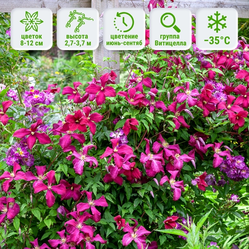 Преимущество №5: клематис Madame Julia Correvon прекрасно смотрится на решетках, перголах или древесных подпорках. Он может быть использован для создания живых занавесок, украшения стен зданий или создания цветущих арок. При желании вы можете выращивать его в большом контейнере.
