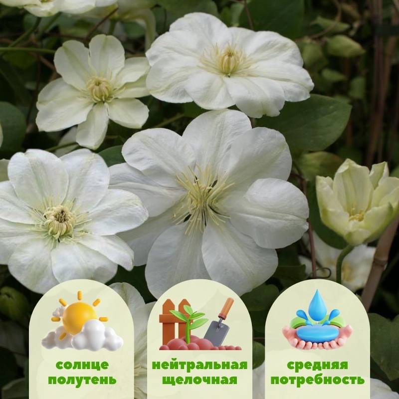 Clematis Mary-Claire можно высадить у стены дома или хозпостройки, чтобы его белые цветы подчёркивали линии архитектуры или, наоборот, скрывали её недостатки. Он хорош для контейнерного выращивания на террасе или балконе, где станет главным украшением летнего отдыха. Белоснежные цветы красиво переплетаются с живыми изгородями из тиса или самшита, создавая контраст форм и текстур. А в компании с гортензиями и декоративными злаками сорт превращает обычный уголок сада в стильный и гармоничный ансамбль.Рекомендации по уходу за клематисом Мэри-Клэр и его посадке: