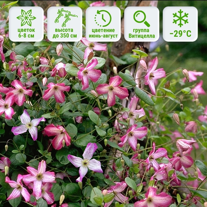 Приготовьтесь лицезреть водопады цветов в течение всего лета. Клематис группы Витицелла формирует маленькие цветочки 6-8 см самой обычной формы, состоящей всего из 4х округлых листочков. Бутончики словно исполняют танец цвета, глубокие пурпурно-розовые края цветков плавно исчезают в нежно-кремовый центр, образуя романтичный и выразительный контраст. Контрастные края в зависимости от погодных условий и освещения могут различаться на несколько тональностей и быть красноватыми или фиолетовыми. Лиана быстро нарастает до отметки 350 см в высоту и более 1 м в ширину, и каждый год осенью требует сильной обрезки (3 тип). Клематис Минуэт обладает важным достоинством - устойчивостью к увяданию клематисов, а также достойной зимостойкостью до -29°C.Универсальность и применение в саду