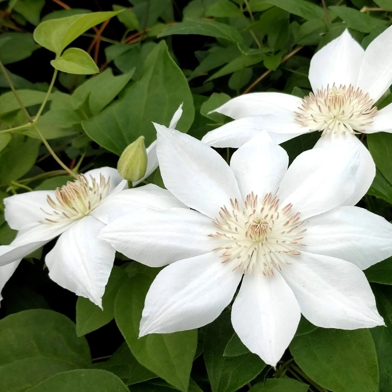 Clematis Mrs George Jackman превосходно смотрится на фасадах и стенах домов, особенно темного цвета, где его кремово-белые цветки будут излучать солнечный свет. Также он одинаково хорош на шпалерах, оградах и перголах, превращаясь в живую «занавесь». Благодаря двум волнам цветения его можно посадить рядом с гортензиями, которые цветут с раннего лета до поздней осени. Кроме этого, компактность сорта позволяет выращивать его в контейнерах на балконах, террасах или у входа, если подобрать устойчивую опору и обеспечить регулярный полив.Рекомендации по уходу за клематисом Миссис Джордж Джекман и его посадке: