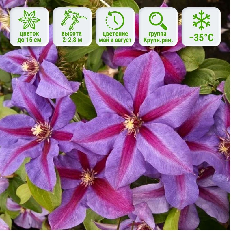 Контрастность окраски делает этот сорт одним из самых запоминающихся среди Крупноцветковых ранних клематисов. Куст достигает высоты 2–2,8 м, формируя плотную лиану, способную легко покрывать опоры. Цветки крупные, в среднем 10–15 см в диаметре, плоской формы, фиолетового окраса с выраженной малиновой полосой по центру каждого лепестка. Первая волна цветения приходится на май–июнь на прошлогодних побегах, вторая на август–сентябрь на молодых. Благодаря высокой зимостойкости до −35°C растение успешно выращивают в разных климатических условиях. Сорт относится ко 2 группе обрезки.Универсальность и применение в саду