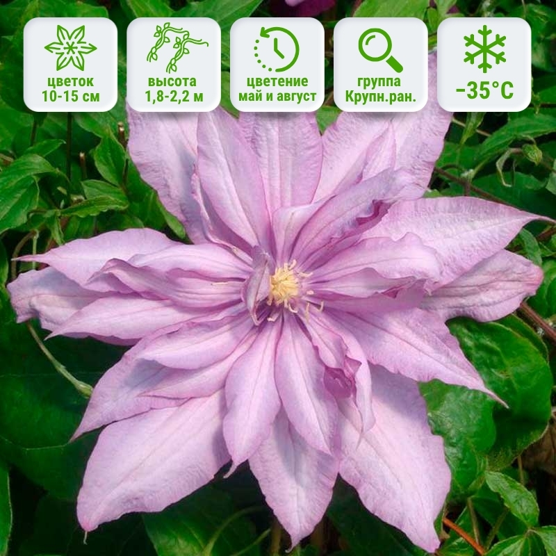 Английский клематис Миссис Спенсер Кастл (Mrs. Spencer Castle) — роскошный сорт с нежными, густомахровыми цветками мягкого лилово-сиреневого оттенка. Этот цветочный ветеран уже более столетия привлекает к себе внимание садоводов, продолжая быть востребованным и надежным растением.
