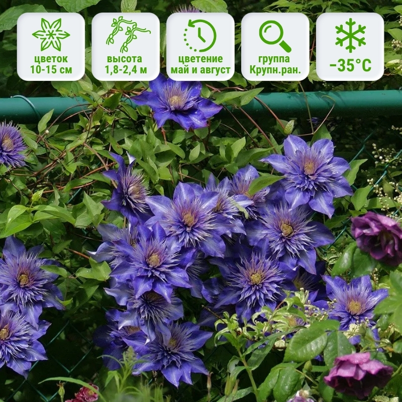 Клематис Multi Blue отличается почти непрерывным цветением с мая по август, это дополнительный плюс, так как Вы и Ваши близкие дольше сможете наслаждаться этим неповторимым цветком. Красочность лианы подчеркнёт близко-растущая жимолость Альпийская, которая в июле-августе наряжается в празднично-ягодные бусы. Светолюбивый сорт клематисов, однако, в южных регионах предпочтительно сажать в полутени, чтобы меньше выгорал. Достойный высоких отзывов клематис Мульти Блю теперь доступен в нашем каталоге. Предпочтительные зоны для посадки 4-9.