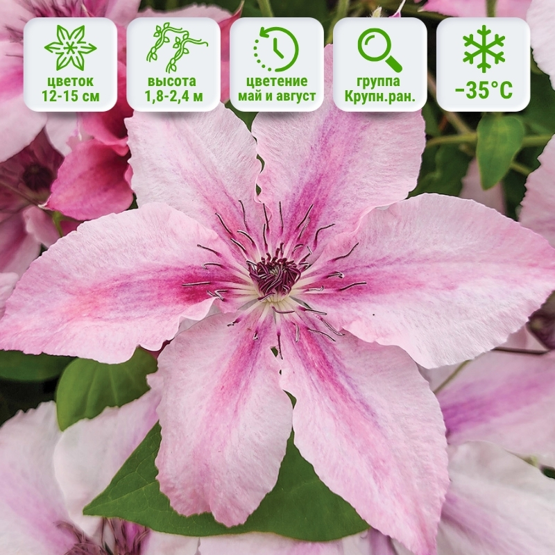 Это сравнительно невысокая лиана, длина плетей колеблется на уровне 180-250 см. Этой длины как раз хватит, чтобы оплести фонарный декоративный столб или куст. Цветки - широкораспахнутые 6-8ми-конечные звезды невесомого бледно-розового цвета с более насыщенным напылением в виде широких полос вдоль каждого чашелистика. Центральная часть композиции - пучок белых нитей с красноватыми пыльниками. Размер цветка в диаметре 12 см.ВАЖНО! Данный сорт рекомендован для посадки в полутени. Полное солнце, особенно присущее регионам с жарким летом, преждевременно обесцвечивает цветок.