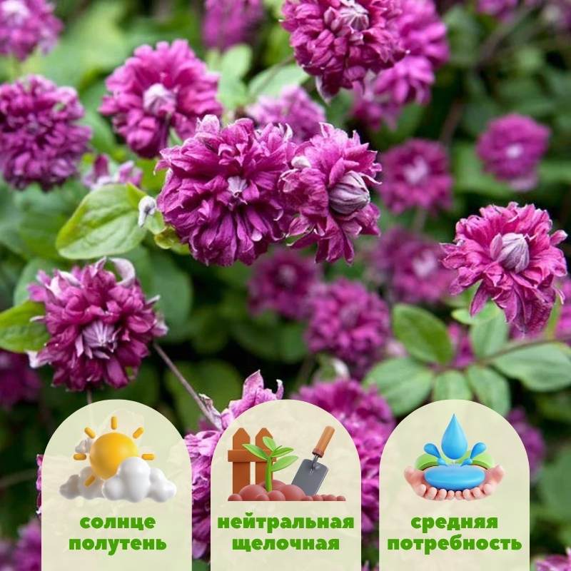 Среднерослый клематис Purpurea Plena Elegans с сочными насыщено-зелеными листиками, достигает высоты около 3 м. Очень любит солнечное пространство, и при этом не прихотлив к почве. Положительные отзывы о клематисах Пурпуреа Плена Элеганс получили широкое распространение по всей России.