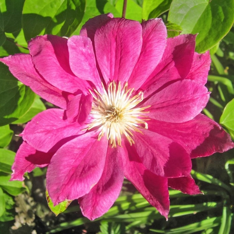 Среднерослая, около 2 м лиана клематиса Red Star обильно усыпана густомахровыми цветками, сладкого малинового оттенка. Пёстрым цветом засияет куст клематиса сорта Ред Стар в период с мая по июнь и вторично с августа по сентябрь. Шикарные крупные цветы, до 16 см в диаметре, ланцентообразные лепестки с волнистой оборкой по краям отлично сочетаются с нежно-сливочного цвета пыльниками.