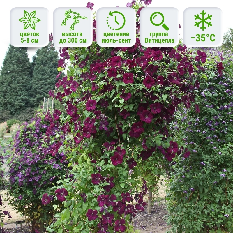 Данный сорт отличается обильным и продолжительным цветением. Небольшие, но многочисленные цветки размером 5–8 см полностью покрывают лиану с июля до сентября. Листва тёмно-зелёная, служит отличным фоном для сияния бархатных лепестков. Куст вырастает до 300 см, самостоятельно цепляясь за опоры и создавая впечатляющие цветочные каскады. Как и все клематисы группы Viticella, сорт демонстрирует высокую устойчивость к болезням, включая увядание, а также обладает высокой зимостойкостью до -35°C. Сорт относится к 3-й группе обрезки, что делает уход за ним простым и удобным.Универсальность и применение в саду
