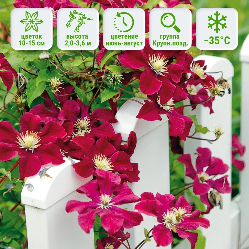 Великолепно смотрится в сочетании с цветами пастельных тонов и на светлых поверхностях. Замечательный клематис Rouge Cardinal вырастает до 2-3 м. в высоту. На фоне темно-зеленой листвы цветочки похожи на сияющие огоньки с желтыми искорками. Благодаря своим цепким черенкам, замечательно крепится к небольшим деревьям и кустарникам. Замечательно подходит для озеленения балконов. Достойный высоких отзывов клематис Руж Кардинал теперь доступен в нашем каталоге. Устойчивый к заболевания и морозам куст.