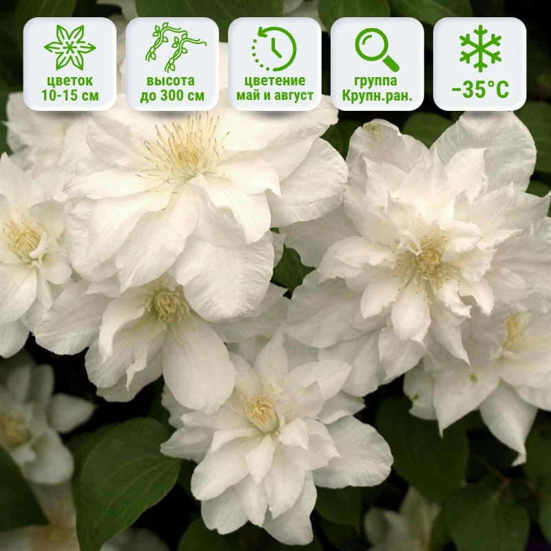 Клематис Сильвия Денни (Sylvia Denny) — изысканный, повторноцветущий сорт с крупными густомахровыми цветками белого цвета, которые особенно эффектно смотрятся на фоне зелени сада. Не вызывающий, но очень притягательный сорт, который ценят за простоту ухода и разнообразие использования.