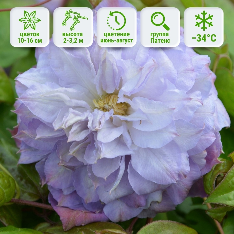 Густомахровые помпезные цветки клематисов Вероника Чойс вырастают до величественных размеров 15-20 см. Градация цвета напоминает омбре- центр цветка постепенно из белоснежного переходит бледно, а затем тёмно-фиолетовым рядам чашелистиков. Нижний ряд чашелистиков особо крупных размеров, всё выше к центру этот объём уменьшается, они становятся более заострёнными и волнистыми.