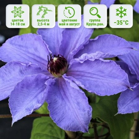 Сильная и энергичная лиана достигает 2,5–4 м в высоту и легко покрывает шпалеры, арки или стены. Цветки диаметром 14–18 см распускаются с мая по июль на прошлогодних побегах, а затем повторно в августе–сентябре уже на новых. Лепестки широкие, слегка волнистые, красивого лавандово-голубого цвета, в центре выделяются ярко-пурпурные пыльники, создающие контраст и усиливающие декоративность. Крупноцветковый раннецветущий клематис Вильям Кеннет относится ко 2 группе обрезки и отличается хорошей зимостойкостью до –35°C.Универсальность и применение в саду