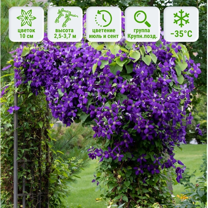 За этот период Вы увидите сотни цветков роскошного тёмно-фиолетового окраса. В цветке присутствуют малиновые прожилки и салатовые выпуклые тычинки. Цветки клематиса Jackmanii простой формы, диаметр их варьируется от 10 до 15 сантиметров. Лиана имеет высокий темп роста, за сезон она способна набрать высоту в 3-4 м. Такой сорт способен создать тенистый уголок в Вашем саду. Обрезка 3го типа.