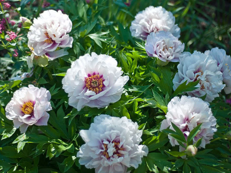 Кусты пиона высотою 80-90 см, цветоносы пиона Cora Louise (Кора Луиза) очень устойчивы и не требуют опоры, благодаря чему куст сохраняет свою форму и не разрушается под весом крупных цветков. Ажурная пышная рассеченная листва сохраняется до поздней осени, становясь из темно-зеленой багряной. В срезке цветоносы Вас порадуют не осыпаясь в течении десяти дней.