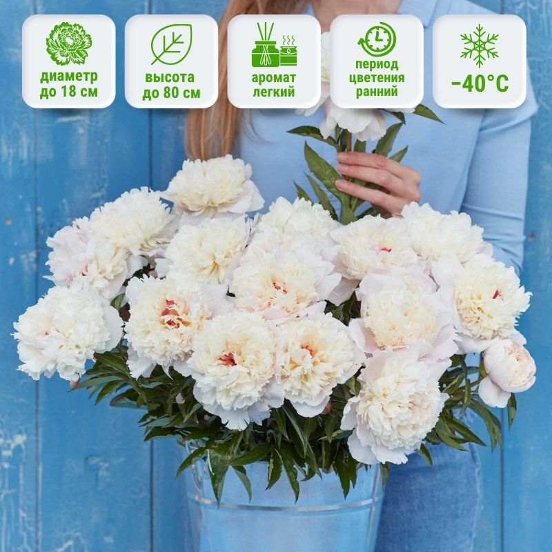 Компактный куст с прочными прямостоящими стеблями формирует невероятной красоты цветки. На стадии бутона они нежно-розовые, а распускаясь, превращаются в снежно-белое чудо. Прямые вогнутые лепестки располагаются правильно. Аромат несильный, но очень приятный. По форме цветок очень напоминает розу. Шаровидные цветки достигают диаметра 18 см. Ширли Темпл — раннецветущий сорт, который зацветает в мае и цветет до июня (до 28 дней).