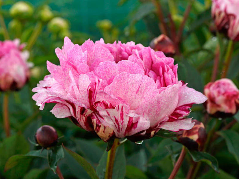 Цветы густомахровые до 16–18 см в диаметре, окрашены в мягкий розовый оттенок с уникальными светлыми и малиновыми пятнышками и полосками, словно созданные из креповой бумаги. Период цветения — средний, обычно приходится на июнь. Куст достигает высоты 90–100 см, имеет крепкие стебли и густую зелёную листву, которая сохраняет декоративность весь сезон. Растение зимостойкое -40°C легко переносит суровые зимы. Легкий приятный аромат делает этот пион незаменимым для тех, кто ценит не только визуальную красоту, но и одержим запахами.Универсальность использования в саду