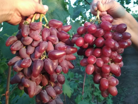 Сорт поедается глазами с самого куста! Уже и не терпится сорвать его гроздь и наконец опробовать, благо, что созревает он довольно в ранние сроки. Южане могут опробовать его вкус в начале августа, северные регионы после 20-х чисел. Также на срок созревания влияет перегруженность лозы, что увеличивает этот период на 10-20 дней. Зрелая ягода красивого красно-розового оттенка с небольшим зеленым ареалом у плодоножки и легким пруином по всей поверхности. Форма ягод вытянутая со слегка изогнутым утонченным носиком. Средняя масса 14-16 г, бывают и по 20 г. Кожица средней плотности и легкой усваяемости, мякоть сочная, хрустящая, сладкая, внутри такая же яркая, как и снаружи. Дегустационная оценка 9,3 балла из 10 возможных.