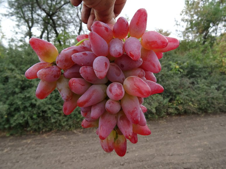 Ягоды винограда Дубровский розовый отличаются своей оригинальностью, если Вы когда-либо сталкивались с перцем огонек, то Вам легко на ум придет ассоциация этих видов. Благо вкус у них разный! Красивые розово-красные ягоды к тому же очень вкусные - дегустационная оценка 9,3 из 10 баллов! Это ли не подтверждение высшей ценности вкуса?! Ягоды очень крупные по 12-15 г, бывают и совсем богатырские - около 20 г. Грозди конической формы, средней плотности, весомой массы 1,2-1,5 кг, реже 2 кг. Длина одной такой кисти 30-40 см. В сочной мясистой мякоти практически не ощущается семян, да их там и не так много 1-2 семечки.