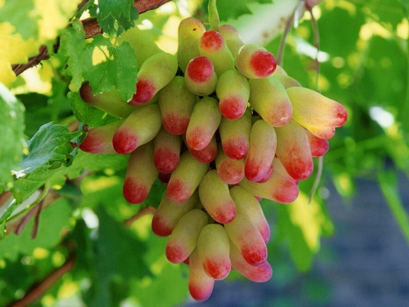 Это весьма уникальная характеристика сорта, которая создала настоящий бум в Японии и в Азии в целом, как только появилась на рынке. На ранней стадии созревания дуэт из желто-зеленого и красного выглядят оригинально и привлекательно, ближе к съему яркий цвет полностью поглощает поверхность ягоды, оставляя лишь остаточное светлое пятно у ножки. Легкий налет придает фиолетовую дымку. Форма ягоды удлиненная со слегка изогнутым концом, длина до 5 см, а масса в среднем 12-13 г. Мякоть винограда Маникюр Фингер плотная, сочная, хрустящая. Форма грозди цилиндрическая, удлиненная, структура плотная, масса в среднем 800 г, но может быть и свыше 1500 кг. Так же и урожайность зависит от опыта садовода и климатических условий, при наличии первого и второго с одного куста снимают до 20 кг.