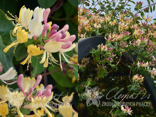 На одном кусте Вы встретите целый микс из розовых, жёлтых и бежевых цветков. Нежное и в то же время яркое сочетание обнажает свою красоту в мае-начале июня. В этот период лиану покрывают сотни небольших трубчатых цветков с отогнутыми лепестками. К июлю формируются ярко-оранжевые не съедобные ягодки, которые продлевают декоративные вид лианы.