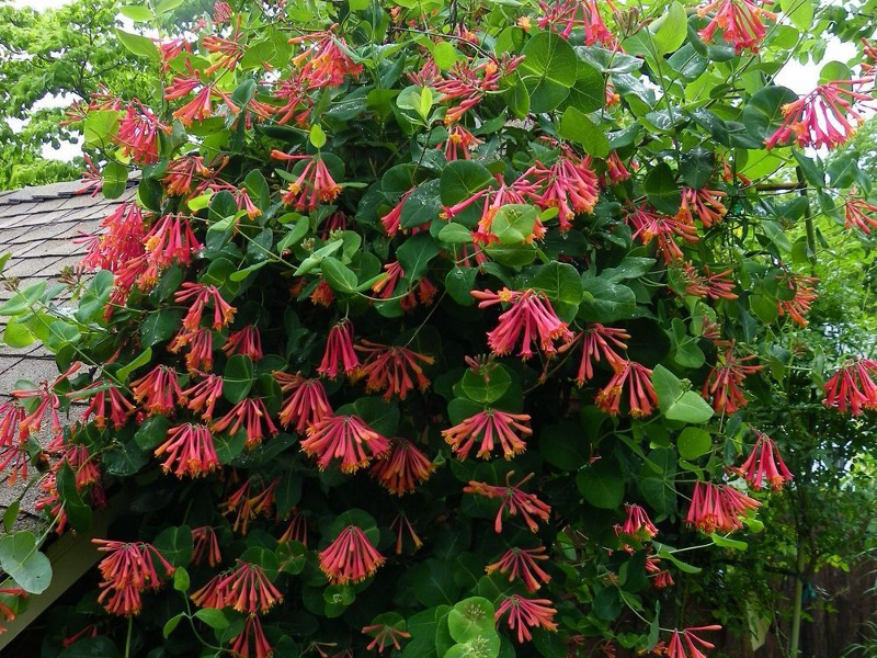Жимолость вьющаяся Брауна- гибридная разновидность кустарника, которая используется для вертикального украшения беседок, арок и стен строений. Только представьте, как шикарно будут смотреться многочисленные яркие цветки на сочном зеленом ковре зелени. По сравнению с клематисами и большинством других лиан, эта цветущая жимолость порадует буйным и непрерывным цветением!